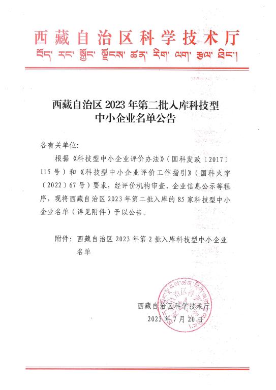 西藏自治區(qū)2023年第2批入庫科技型中小企業(yè)名單公告
