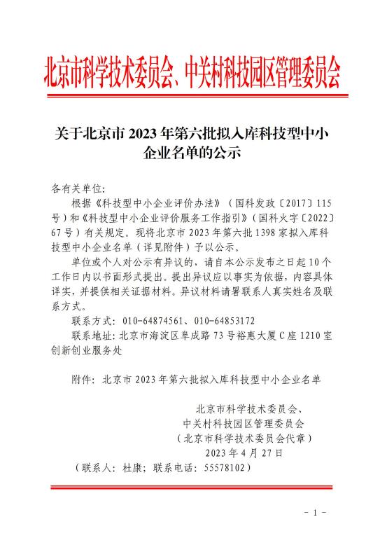 北京市2023年第6批擬入庫科技型中小企業(yè)名單公示