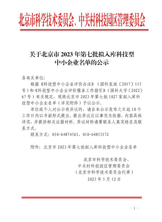 北京市2023年第7批擬入庫科技型中小企業(yè)名單公示