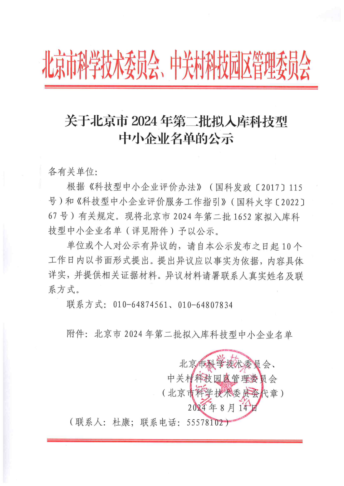 北京市2024年第2批擬入庫科技型中小企業(yè)名單公示