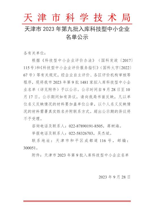 天津市2023年第9批擬入庫科技型中小企業(yè)名單公示