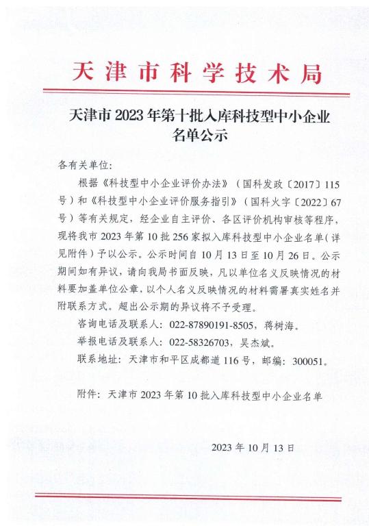 天津市2023年第10批擬入庫科技型中小企業(yè)名單公示