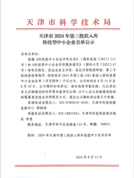 天津市2024年第3批擬入庫科技型中小企業(yè)名單公示