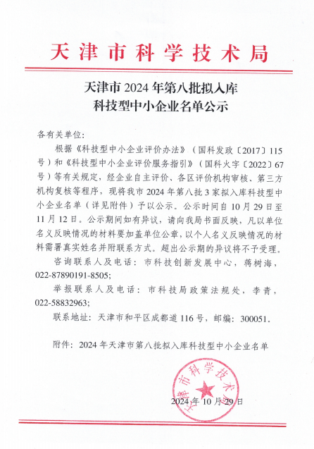 天津市2024年第8批擬入庫科技型中小企業(yè)名單公示