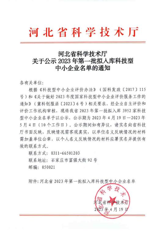 河北省2023年第1批擬入庫科技型中小企業(yè)名單公示