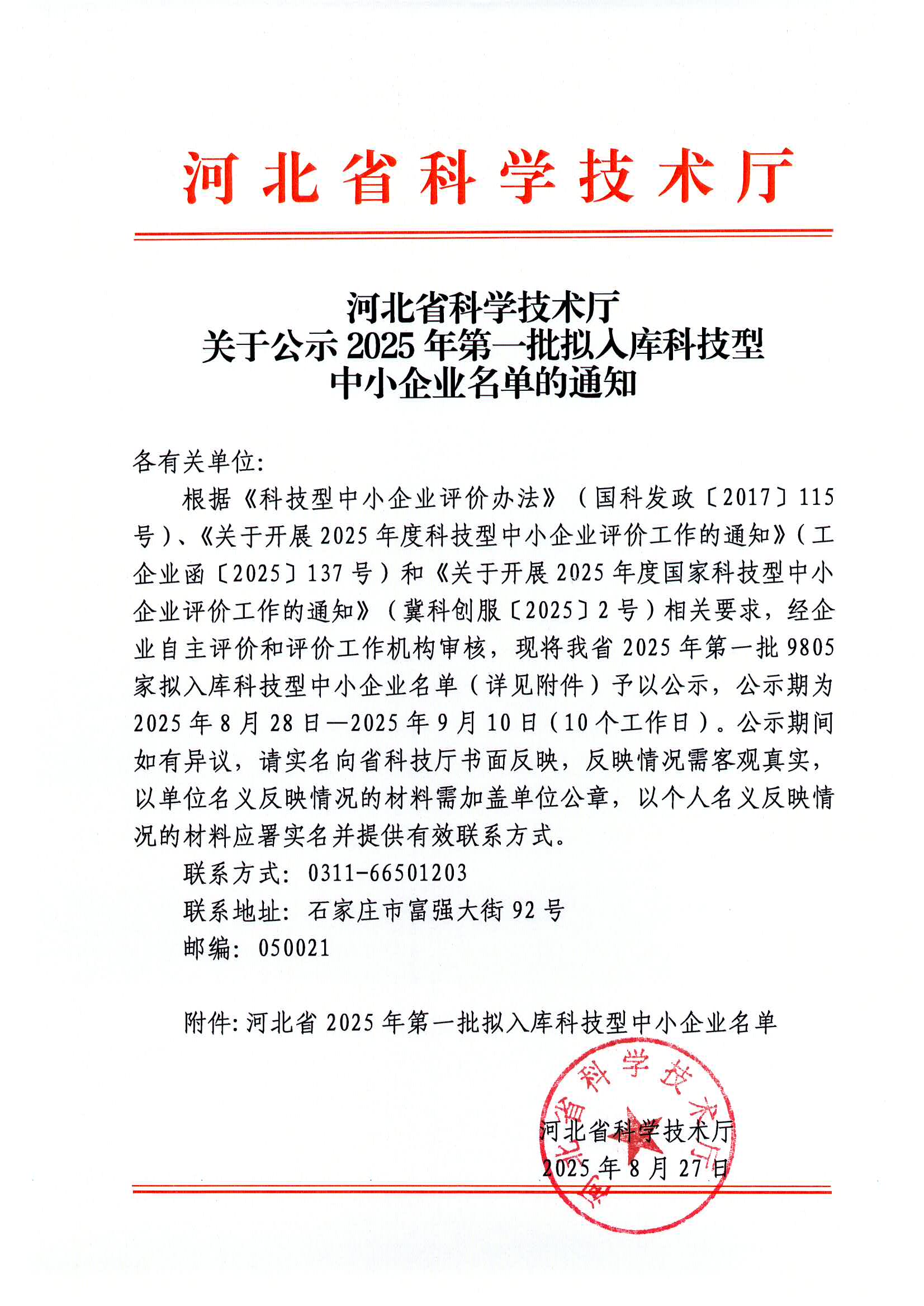 河北省2025年第1批擬入庫科技型中小企業(yè)名單公示