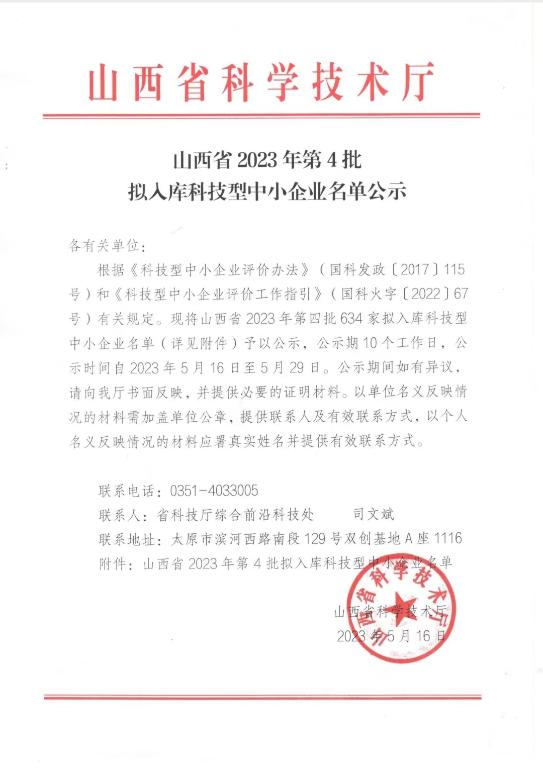 山西省2023年第4批擬入庫科技型中小企業(yè)名單公示