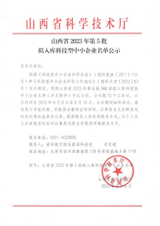 山西省2023年第5批擬入庫科技型中小企業(yè)名單公示