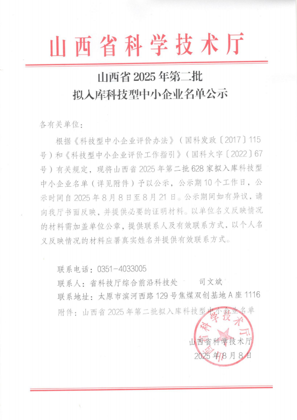 山西省2025年第2批擬入庫科技型中小企業(yè)名單公示