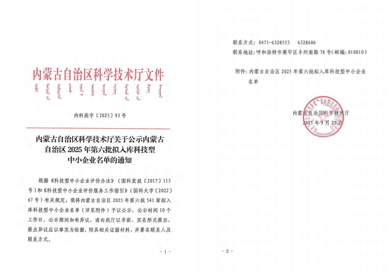 內(nèi)蒙古自治區(qū)2025年第6批擬入庫科技型中小企業(yè)名單公示