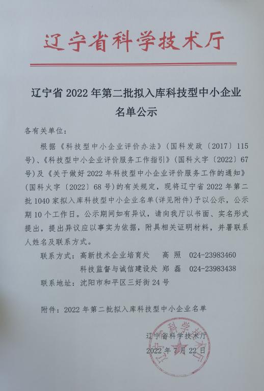 遼寧省2022年第2批擬入庫科技型中小企業(yè)名單公示