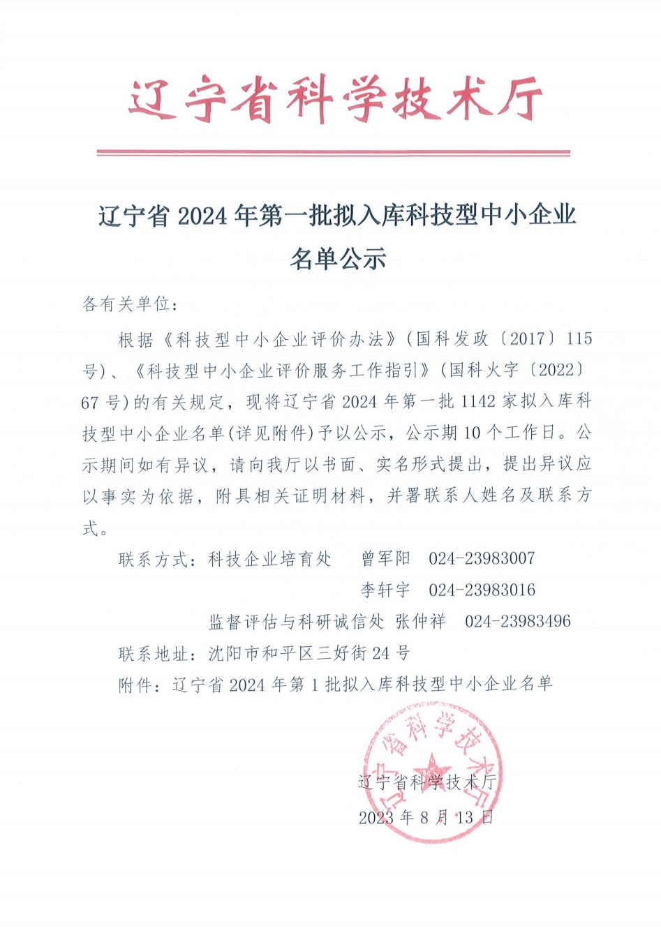 遼寧省2024年第1批擬入庫科技型中小企業(yè)名單公示