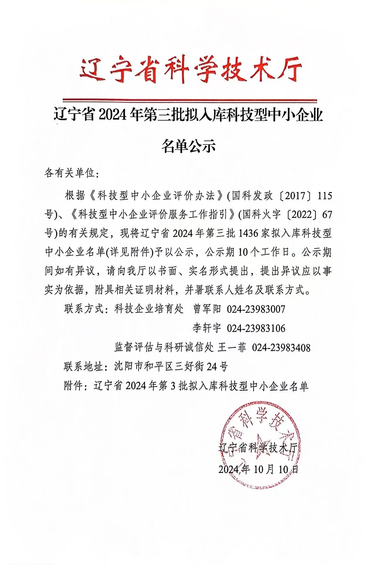 遼寧省2024年第3批擬入庫科技型中小企業(yè)名單公示