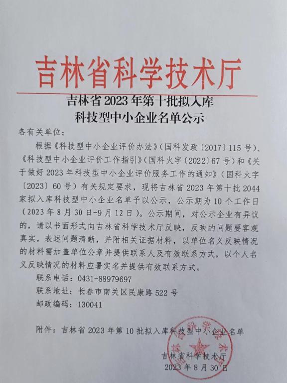 吉林省2023年第10批擬入庫(kù)科技型中小企業(yè)名單公示正文.jpg PICTURE
