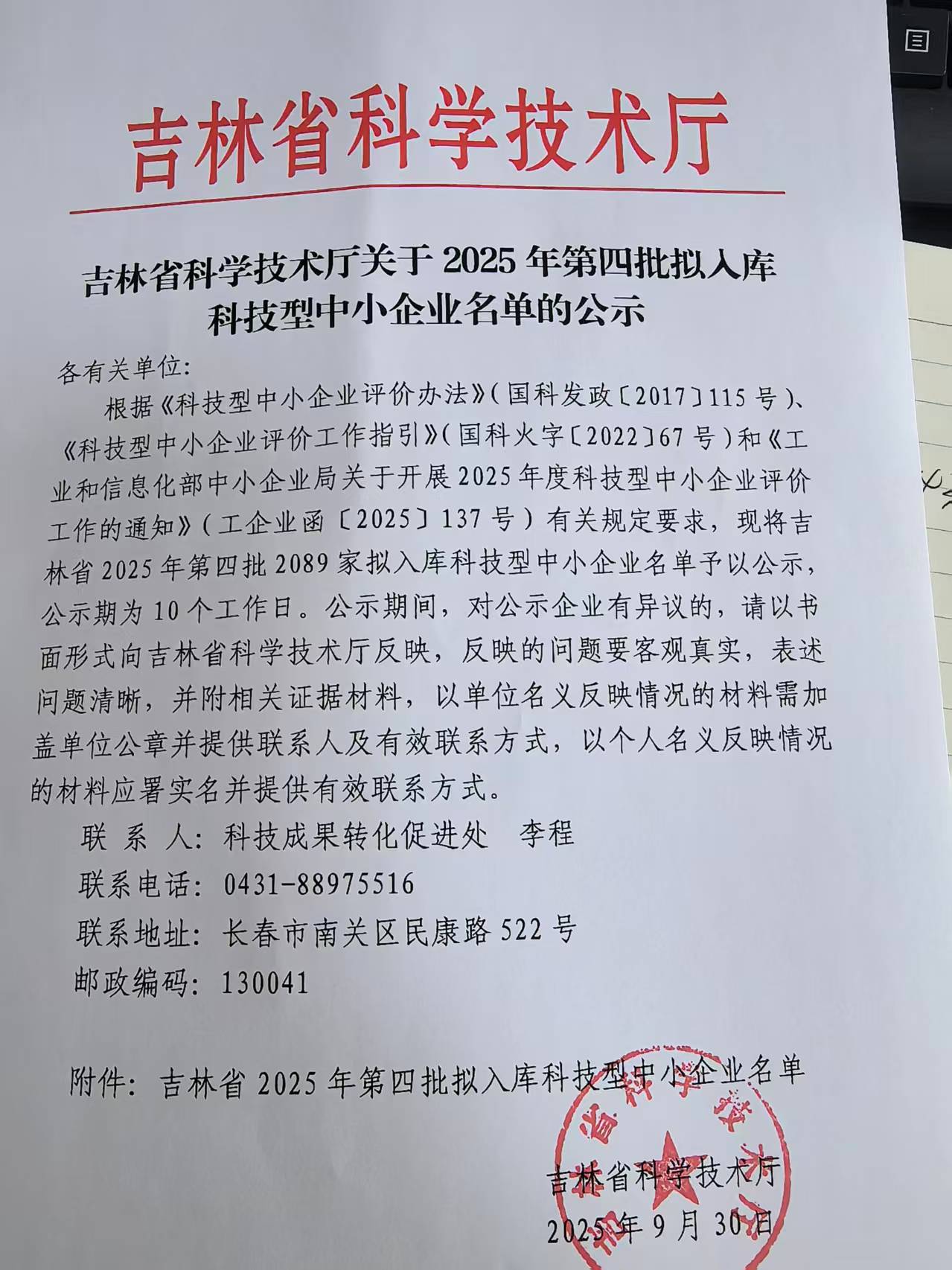吉林省2025年第4批擬入庫科技型中小企業(yè)名單公示