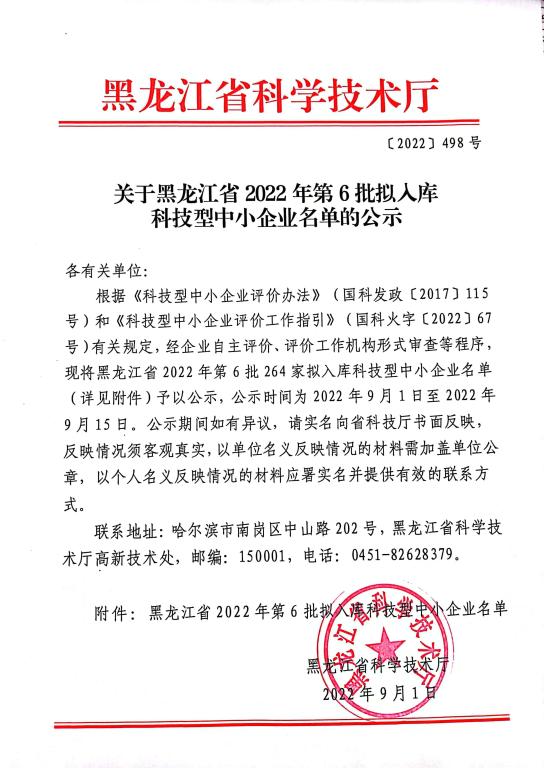 黑龍江省2022年第6批擬入庫科技型中小企業(yè)名單公示