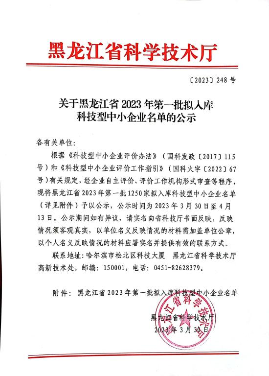 黑龍江省2023年第1批擬入庫科技型中小企業(yè)名單公示