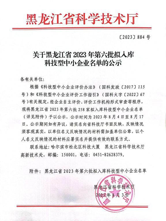 黑龍江省2023年第6批擬入庫科技型中小企業(yè)名單公示