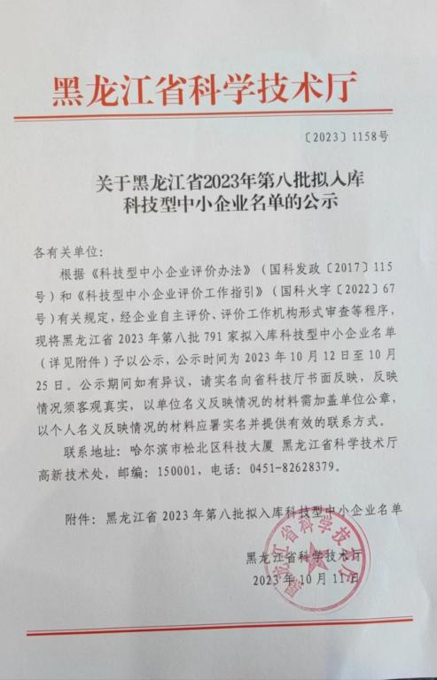 黑龍江省2023年第8批擬入庫科技型中小企業(yè)名單公示