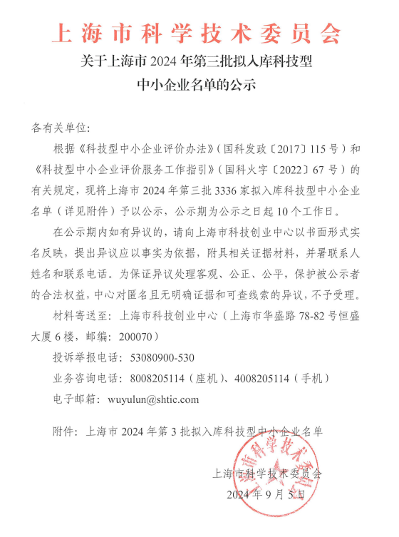 上海市2024年第3批擬入庫科技型中小企業(yè)名單公示