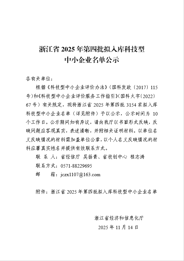 浙江省2025年第4批擬入庫科技型中小企業(yè)名單公示