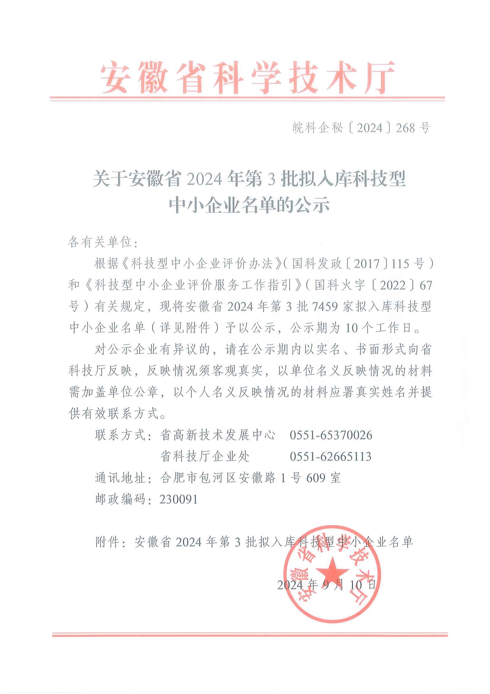 安徽省2024年第3批擬入庫(kù)科技型中小企業(yè)名單公示