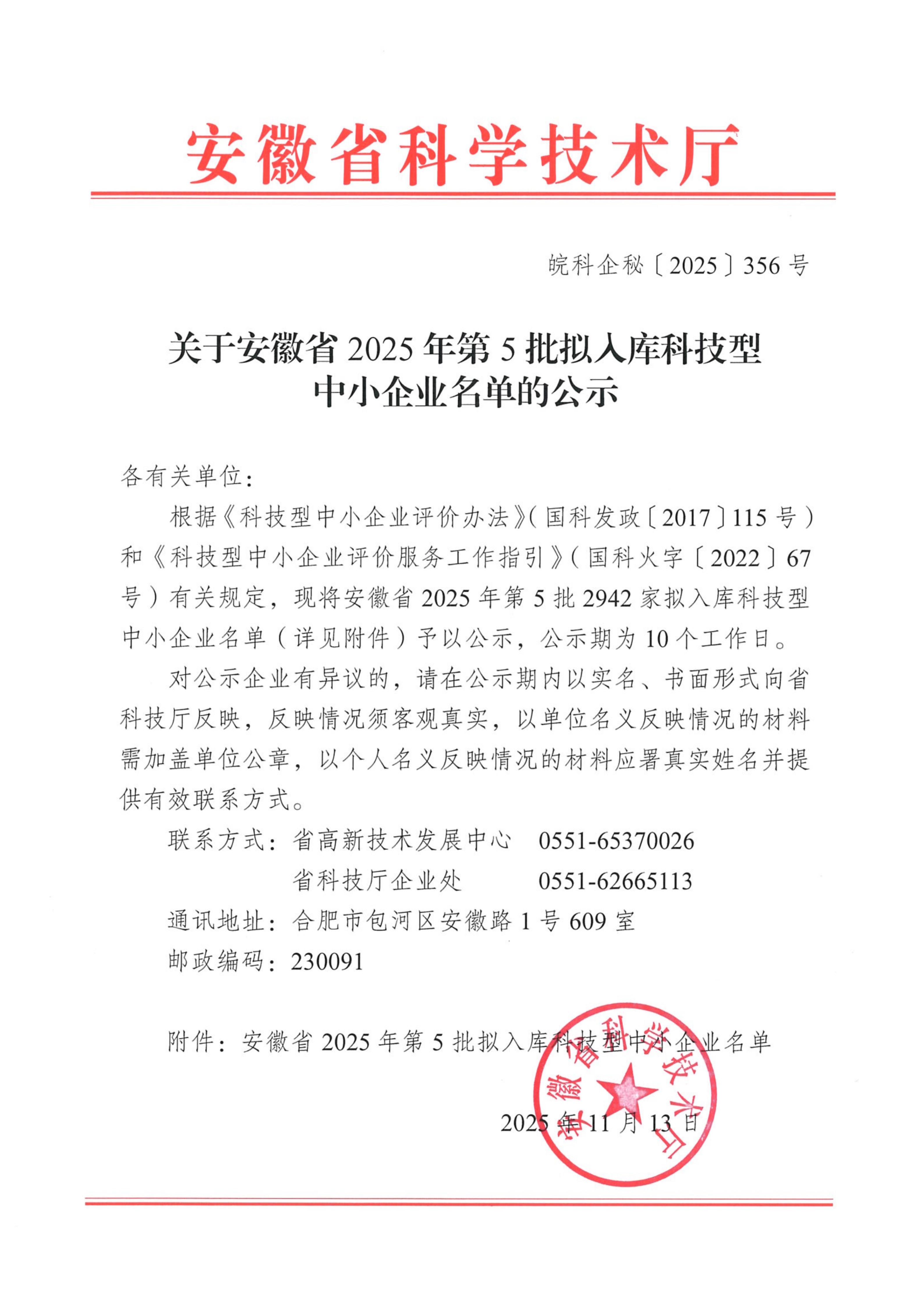 安徽省2025年第5批擬入庫科技型中小企業(yè)名單公示