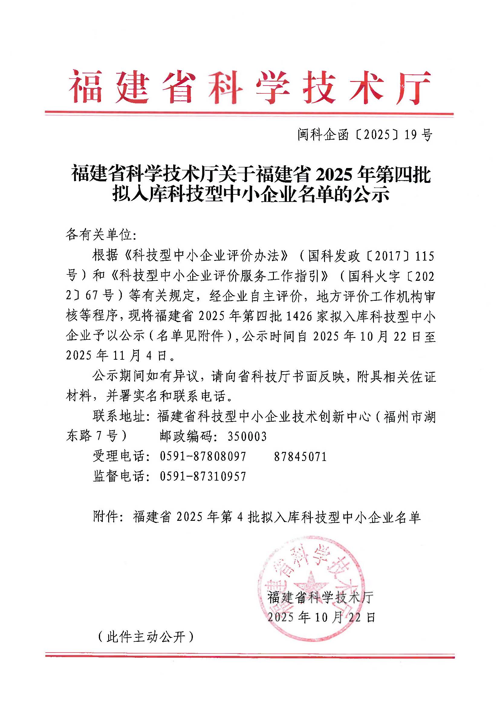福建省2025年第4批擬入庫科技型中小企業(yè)名單公示