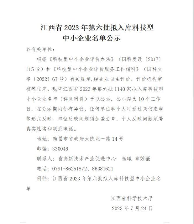江西省2023年第6批擬入庫科技型中小企業(yè)名單公示