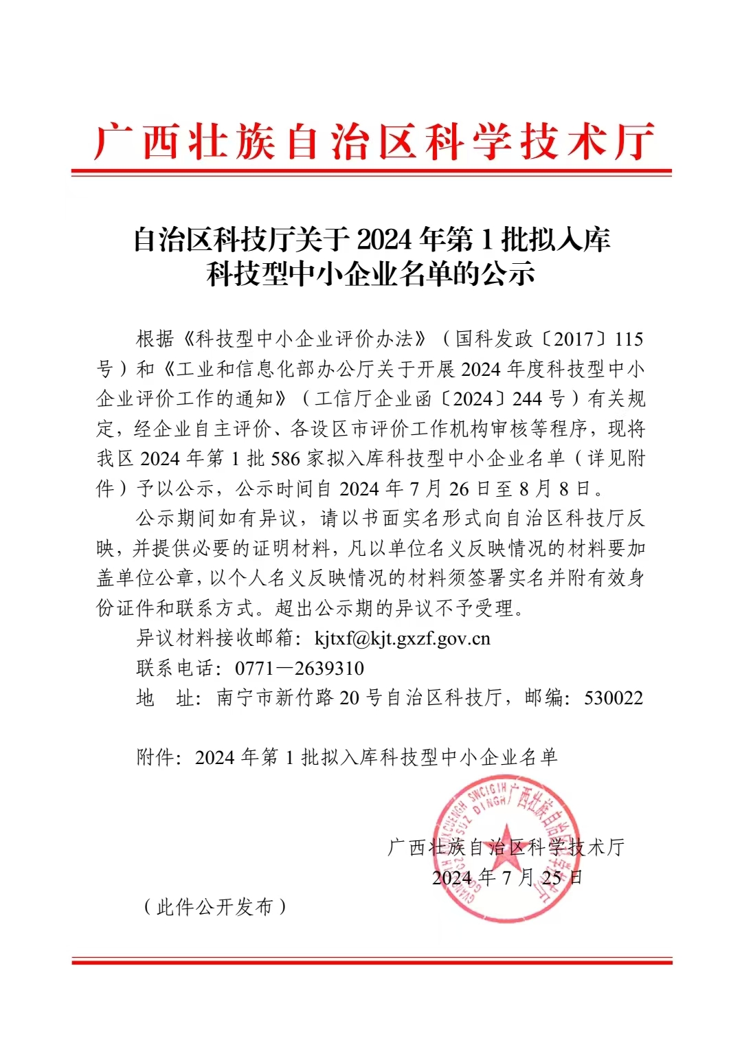廣西壯族自治區(qū)2024年第1批擬入庫科技型中小企業(yè)名單公示