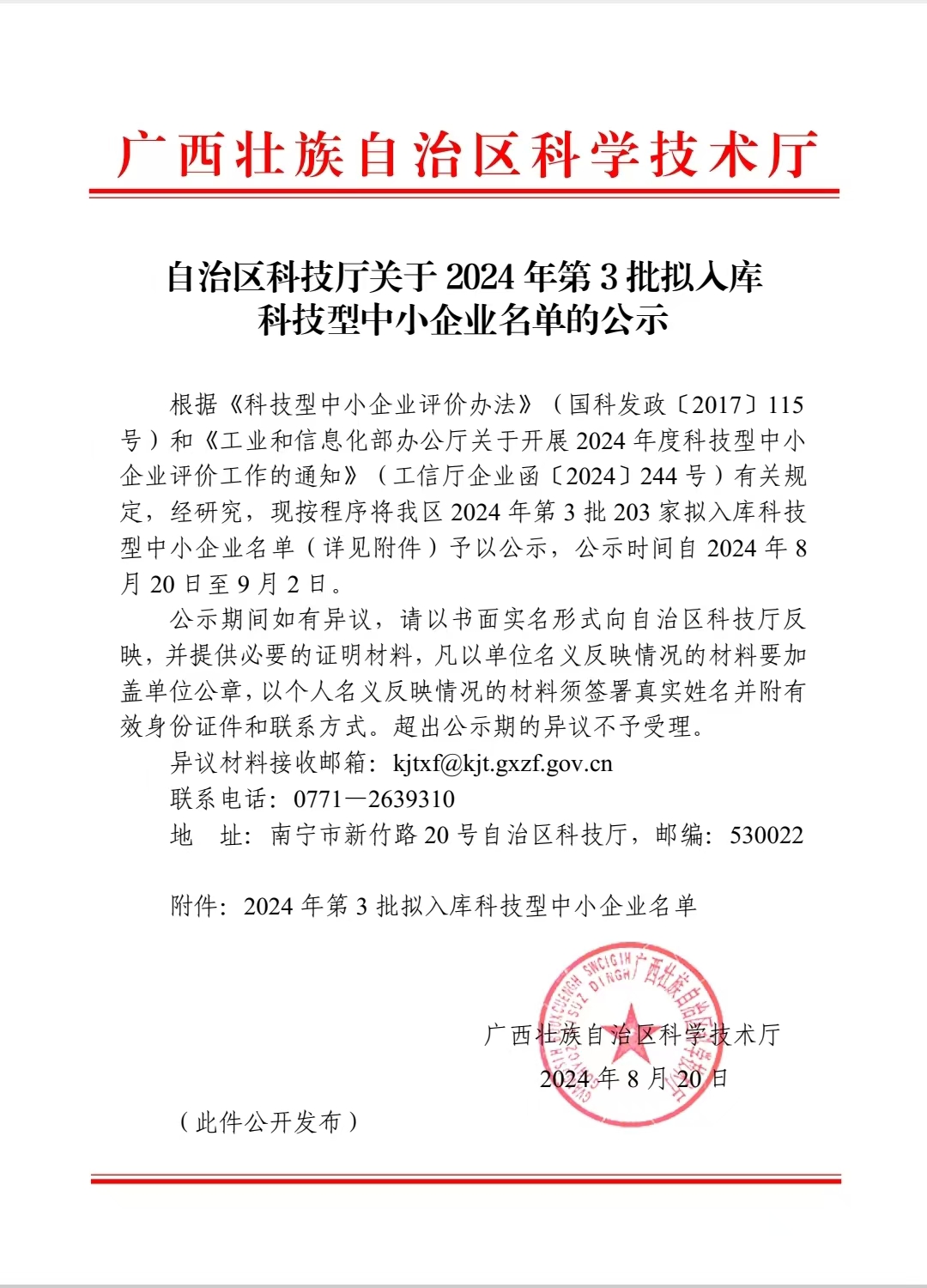 廣西壯族自治區(qū)2024年第3批擬入庫科技型中小企業(yè)名單公示
