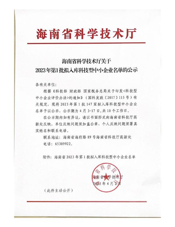 海南省2023年第1批擬入庫科技型中小企業(yè)名單公示