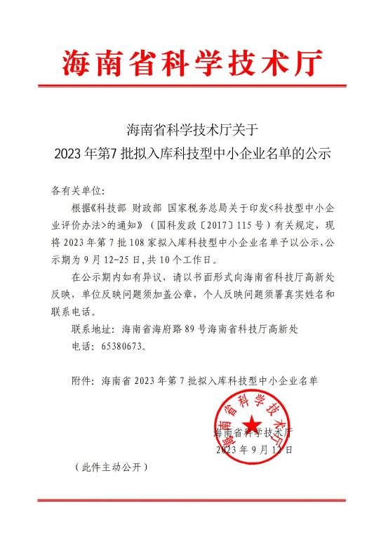 海南省2023年第7批擬入庫科技型中小企業(yè)名單公示