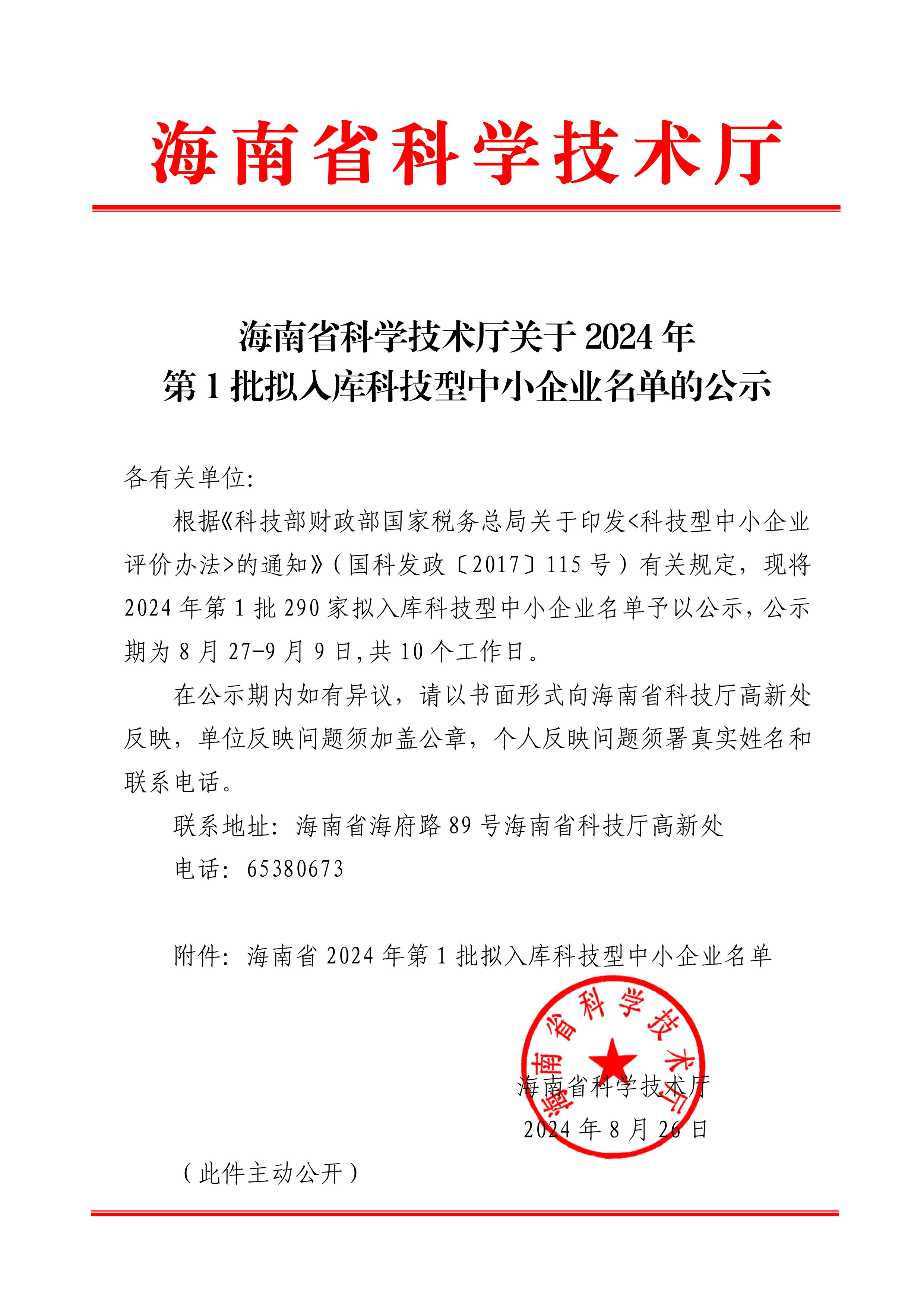 海南省2024年第1批擬入庫科技型中小企業(yè)名單公示