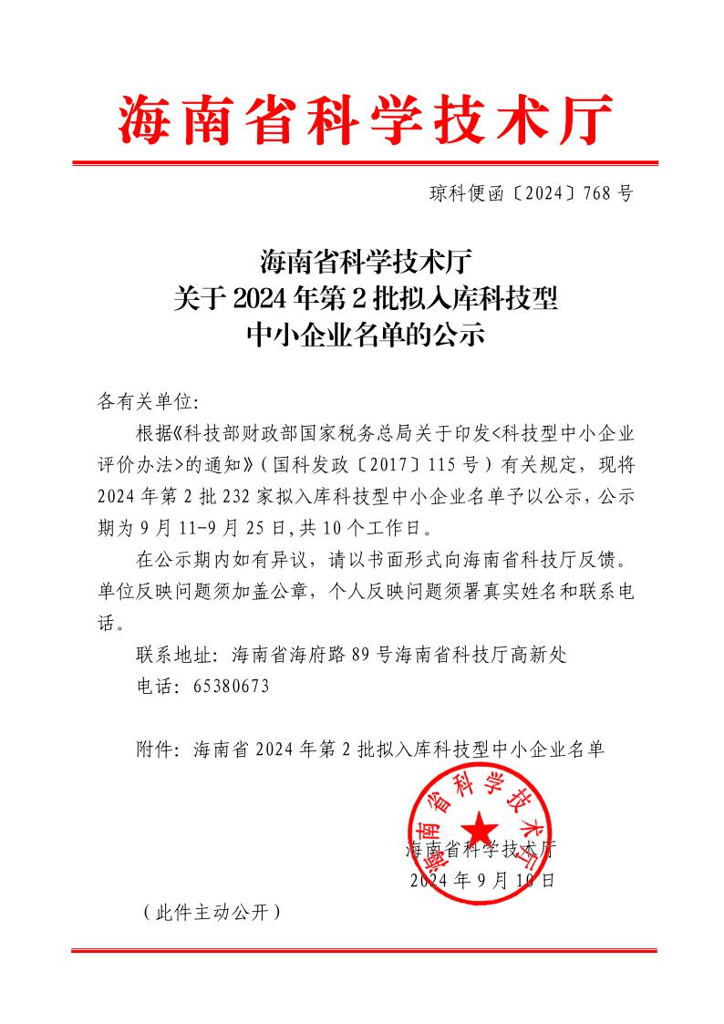 海南省2024年第2批擬入庫(kù)科技型中小企業(yè)名單公示正文.jpg PICTURE