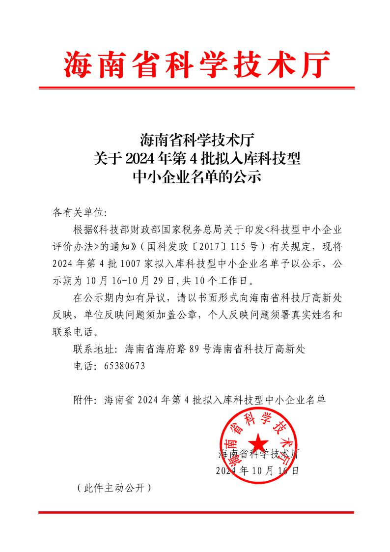 海南省2024年第4批擬入庫科技型中小企業(yè)名單公示