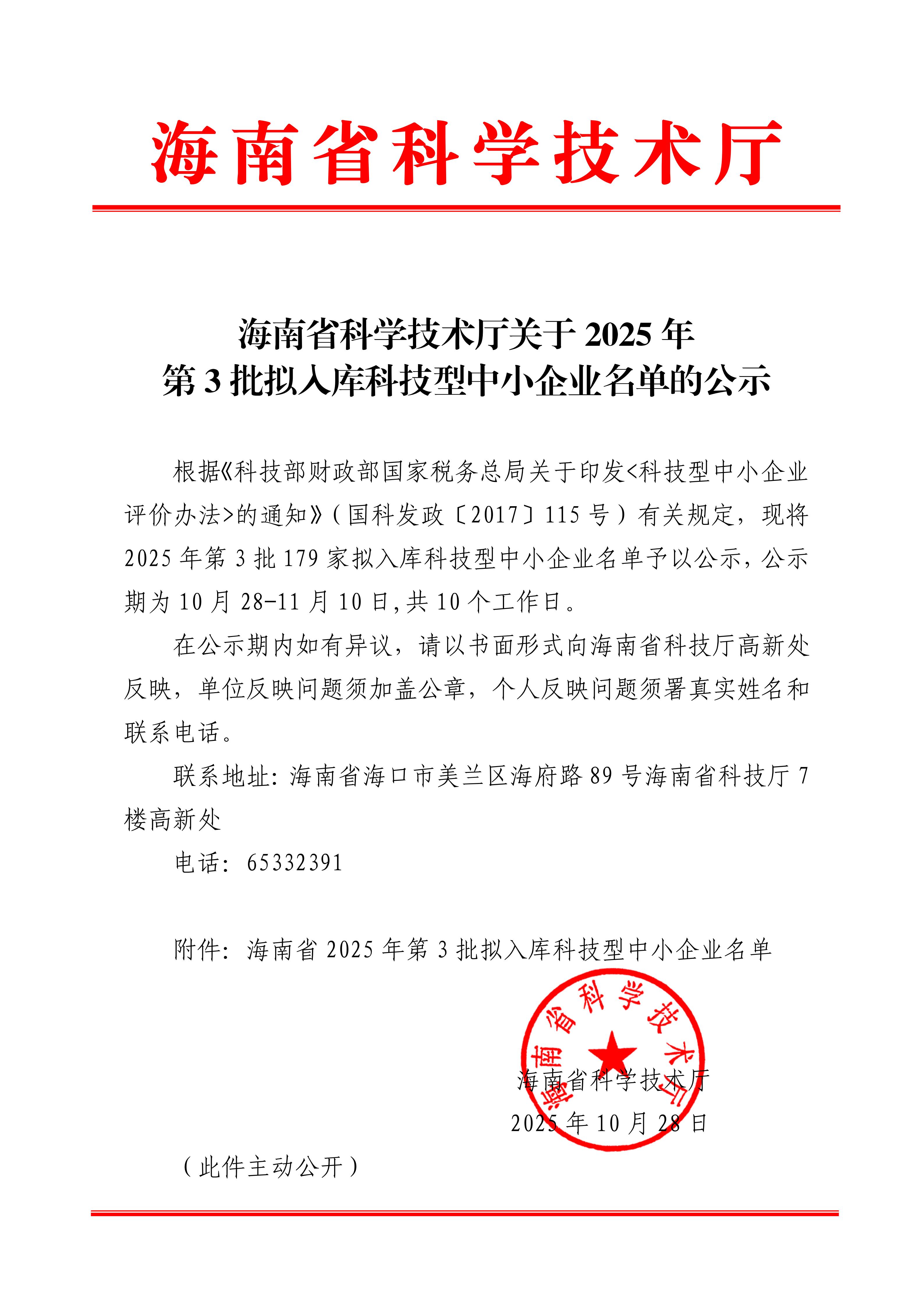 海南省2025年第3批擬入庫(kù)科技型中小企業(yè)名單公示正文.jpg PICTURE