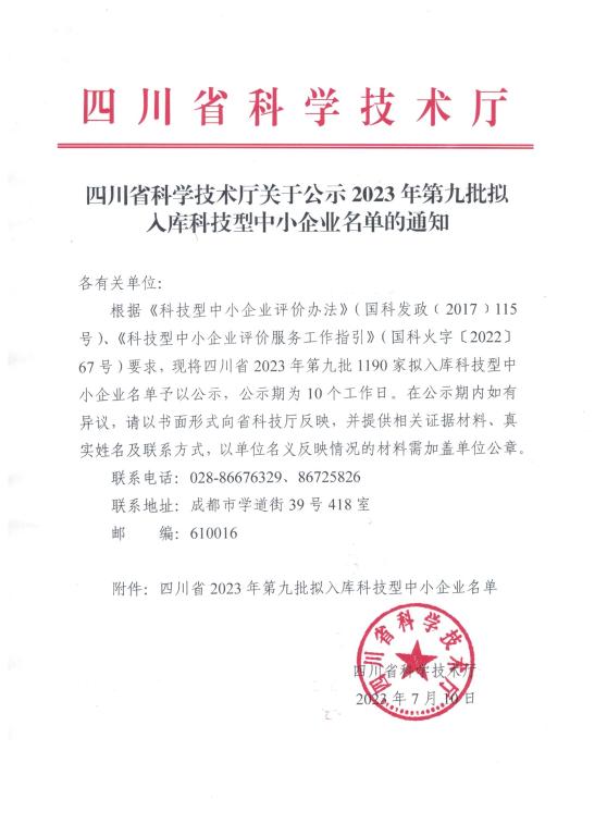 四川省2023年第9批擬入庫科技型中小企業(yè)名單公示