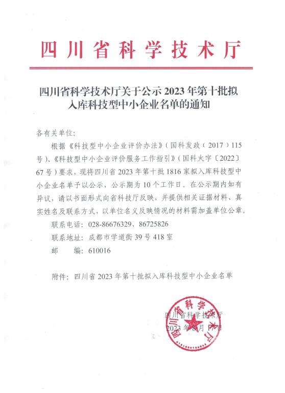 四川省2023年第10批擬入庫科技型中小企業(yè)名單公示