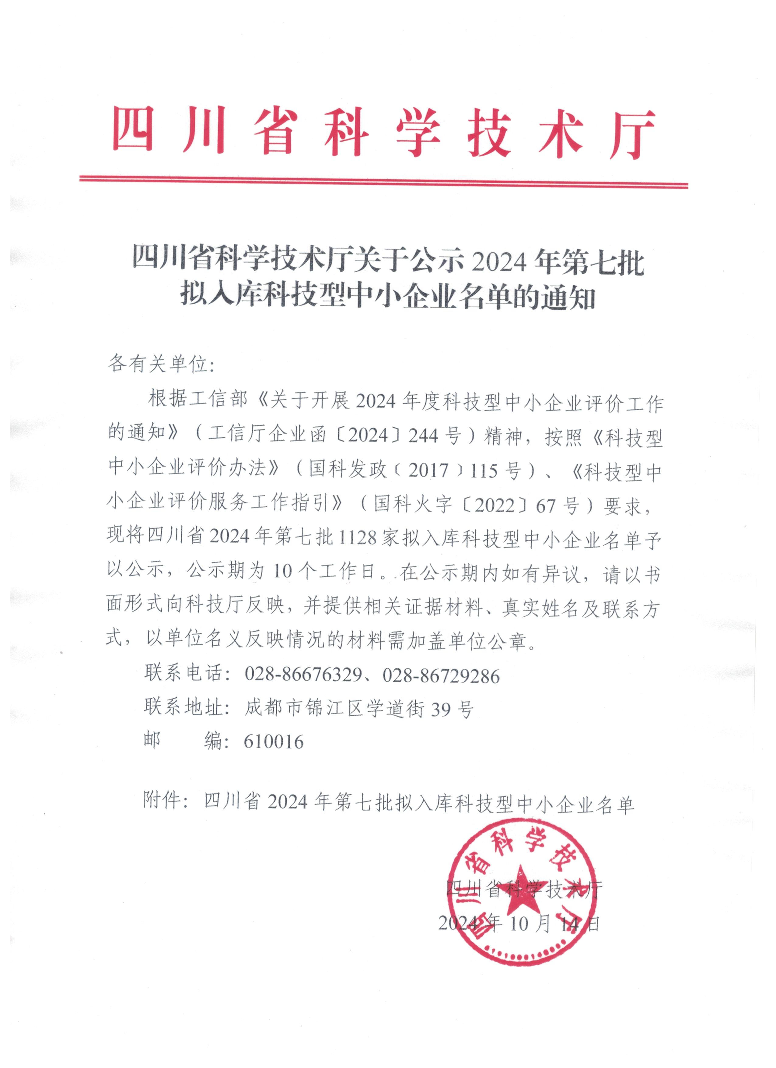 四川省2024年第7批擬入庫科技型中小企業(yè)名單公示