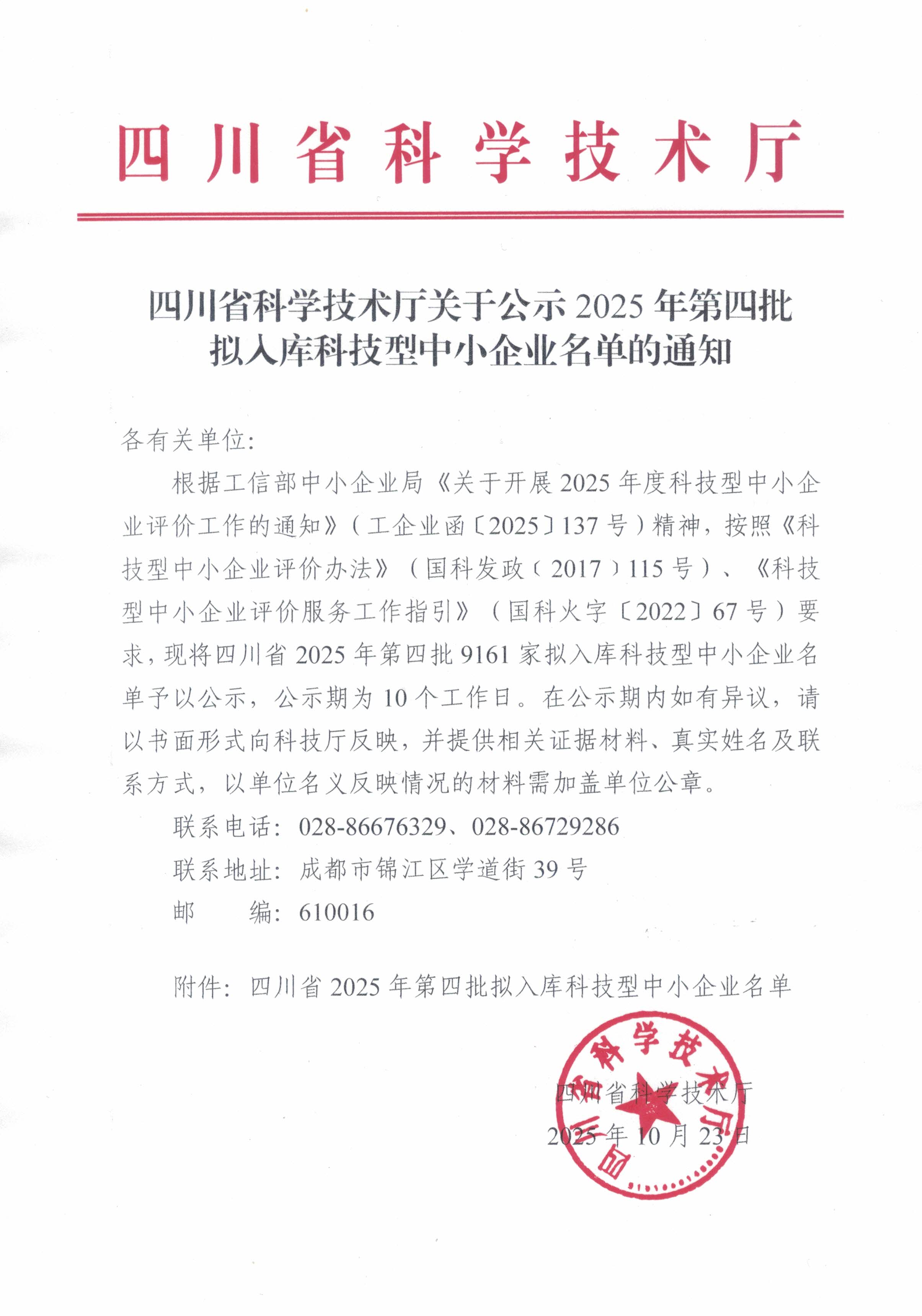 四川省2025年第4批擬入庫科技型中小企業(yè)名單公示