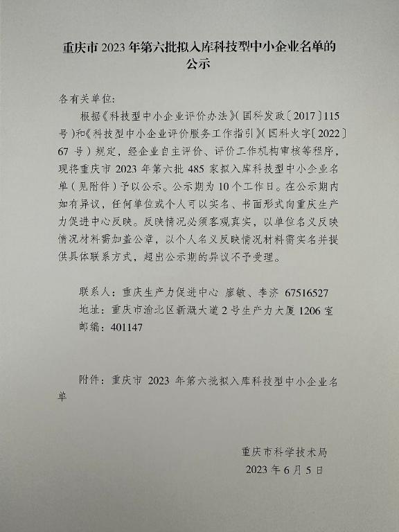 重慶市2023年第6批擬入庫科技型中小企業(yè)名單公示