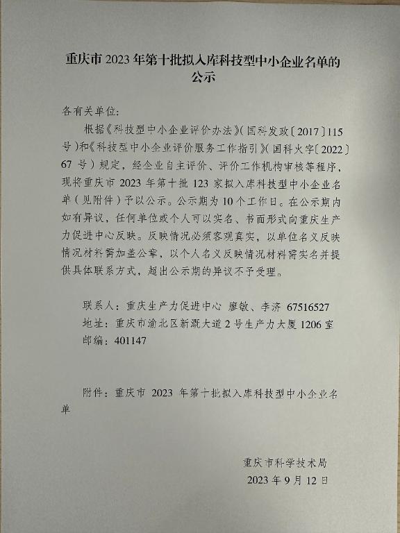 重慶市2023年第10批擬入庫(kù)科技型中小企業(yè)名單公示正文.jpg PICTURE
