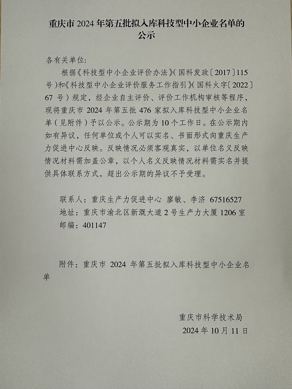 重慶市2024年第5批擬入庫科技型中小企業(yè)名單公示