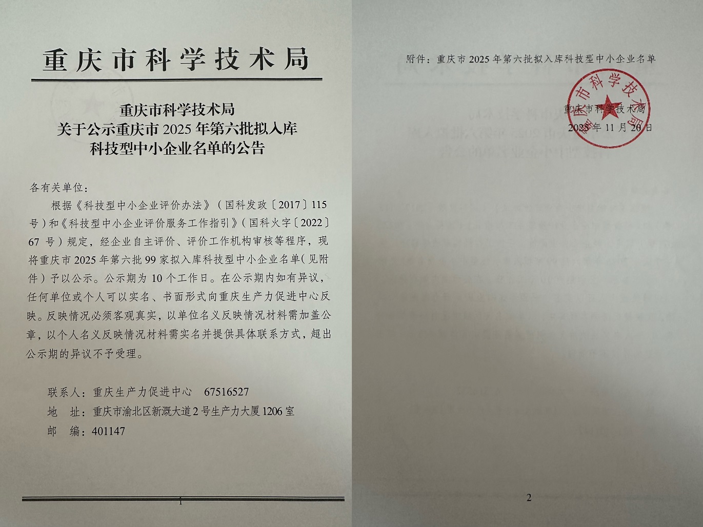 重慶市2025年第6批擬入庫科技型中小企業(yè)名單公示