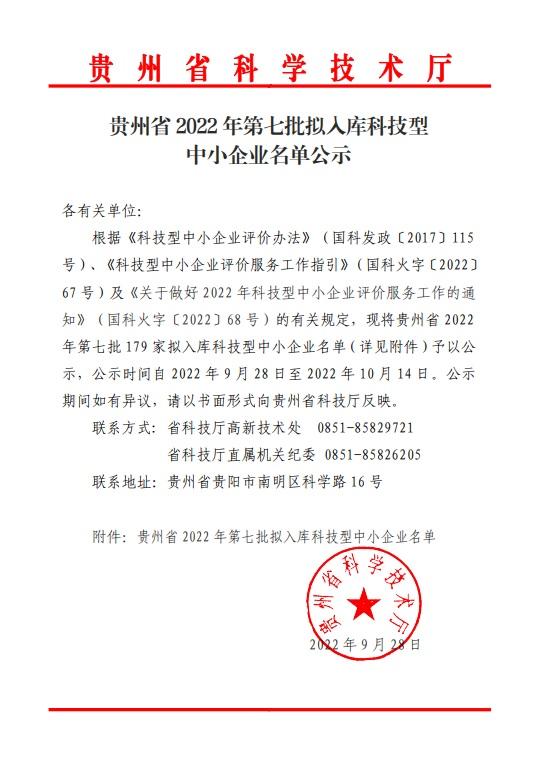 貴州省2022年第7批擬入庫科技型中小企業(yè)名單公示