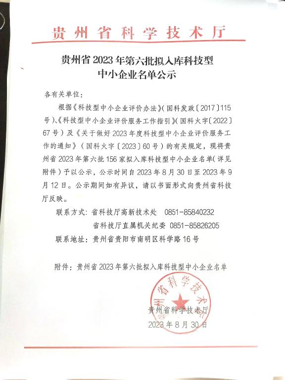 貴州省2023年第6批擬入庫科技型中小企業(yè)名單公示