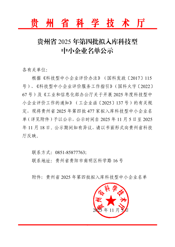 貴州省2025年第4批擬入庫科技型中小企業(yè)名單公示