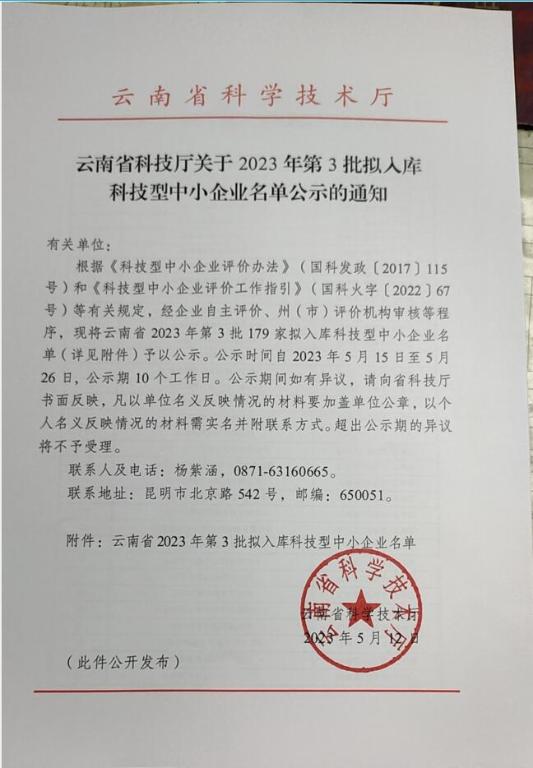 云南省2023年第3批擬入庫科技型中小企業(yè)名單公示