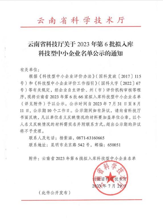 云南省2023年第6批擬入庫(kù)科技型中小企業(yè)名單公示正文.jpg PICTURE